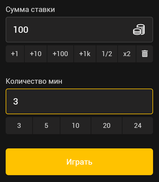Введите сумму ставки, выберите количество мин и нажмите кнопку "Играть"