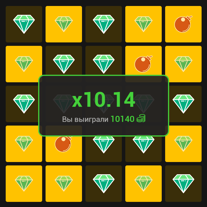 Поле состоит из 25 ячеек, изначально скрытых. Нажатие на ячейку раскрывает ее. Если в ячейке содержался кристалл, увеличивается коэффициент, если мина - игра завершается.