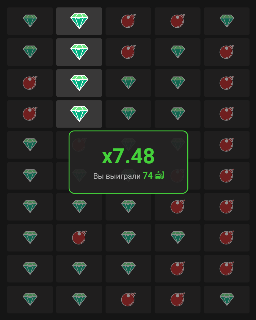 Введите сумму ставки, выберите количество мин в ряду и нажмите кнопку "Играть"